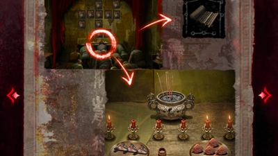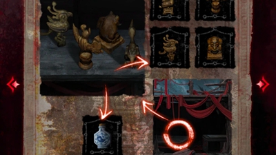 6、【女】破解功德箱上的机关,拾取其中的布娃娃、木块和铜镜。