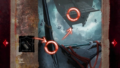 39、【男】将绳子绑到楼面的飞机残骸上,使用弓箭将绳子射到古船升起的风帆上。