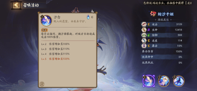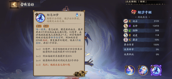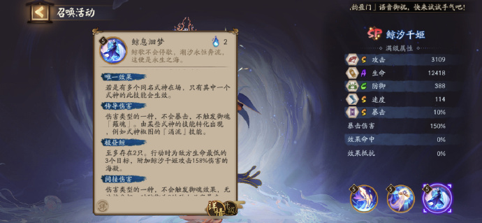 至多存在2只。行动时为敌方生命最低的3个目标,附加鲸汐千姬攻击158%伤害的海凝。