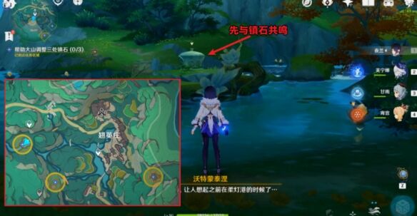 (1)先与水镇石共鸣,池塘中的莲花灯会移动位置,等待莲花灯停止移动