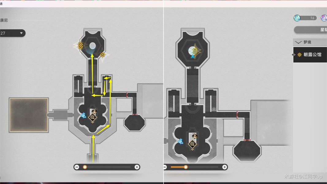 (1)切换黄泉视角,和瓦尔特一起进入朝露公馆,接着去下图位置过剧情即可完成。