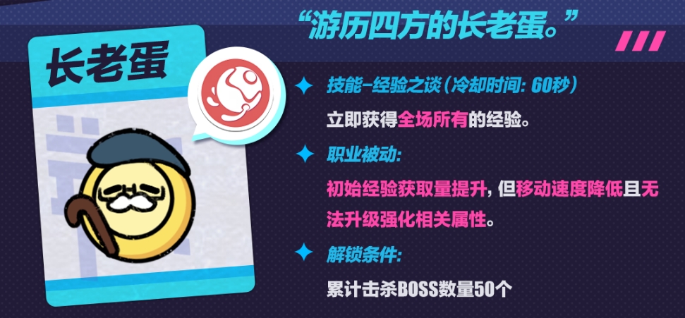 长老蛋的升级速度非常迅速,能在前中期快速觉醒技能。但该职业的移动速度较慢且无法获得移动速度强化加成,因此蛋仔可以选择减速或控制技能来辅助对局。