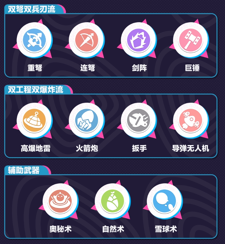 可以选择重弩+连弩+剑阵+巨锤的双弩双兵刃流,或者高爆地雷+火箭炮+扳手+导弹无人机的双工程双爆炸流,以获得最大化的加成。辅助技能推荐奥秘术、自然术或雪球术来防止变异蛋贴脸攻击。