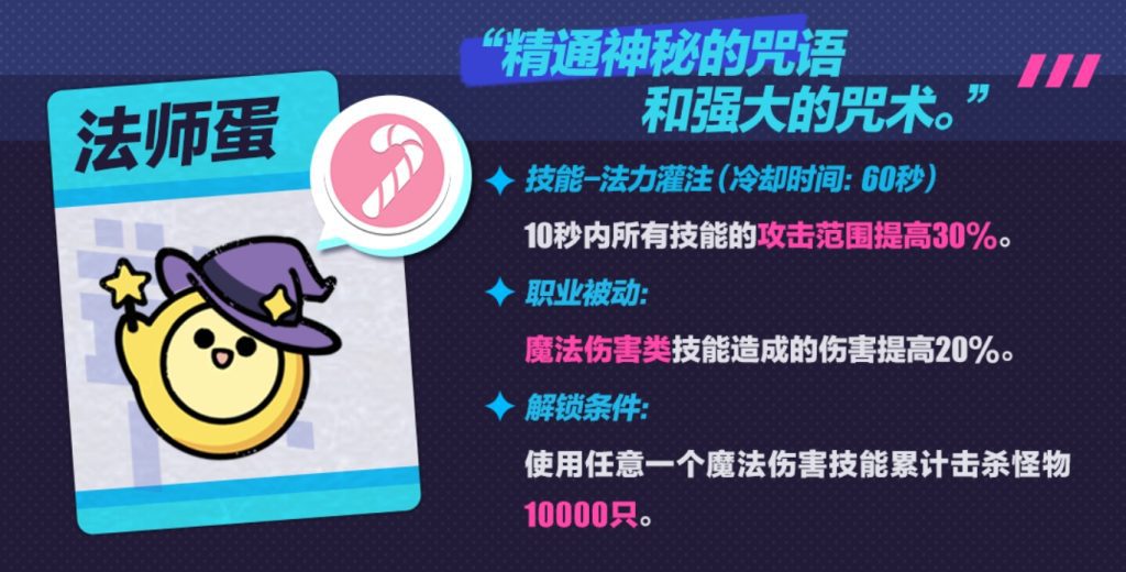 法师蛋有丰富的法术选择,可以根据不同的流派来进行搭配。例如,法术流可以选择【法力燃烧】、【法力源泉】;魔法飞剑流可以选择【近战法师】;法术控制流可以选择【超导磁场】、【燃烧墓延】、【冻结爆炸】等对抗变异蛋。