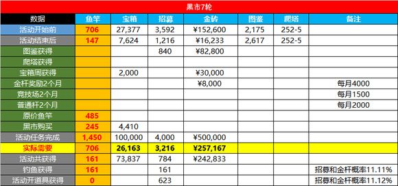 当然,这是讨论的50+1600,也就是99档完成的情况,要是脸最黑,那就进场前多买140杆就行了,用不完就留着下次嫖金鱼用,或者金砖消耗买别的,干别的,如果元旦是黑市周开消耗,那0氪选择稍微多了一些。