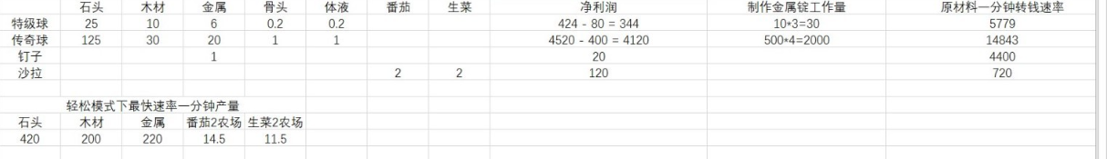咱们就用传奇球的效率和种菜比一比,图中使用沙拉刷钱的方式,如果想要达到传奇球的效率,得使用大概40个番茄和40个生菜农场,但实际上沙拉刷钱在种菜中不是最快的,披萨更快,因为披萨的原材料牛奶直接买,别的材料生产速度是比生菜要快的,而且赚的钱还多,但是即便如此,要想达到传奇球的效率,依然至少需要小几十个小麦农场和番茄农场才行,而且由于传奇球的生产材料是木石金,这些材料的大量产出也可以不全部用于刷钱,还可以作别的东西,而农场的话除了吃和卖之外,没有别的用处,你实际上还是需要建立这些工厂,所以这些东西无论如何都要建。