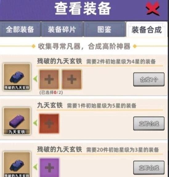 1、九天玄铁可以通过合成及兑换获得,十个破损的九天玄铁(破铁),可以合成一个九天玄铁(铁)