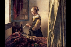 荷兰画家维米尔的作品《窗前读信的女子》绘于1657年。画面中一个女子在打开的窗前静静地阅读远方的来信,右侧亚麻布制成的青幔一直垂到地上,赋予了画作舞台般的效果。在前景中的桌面上,铺展着红色绣花的东方桌毯...